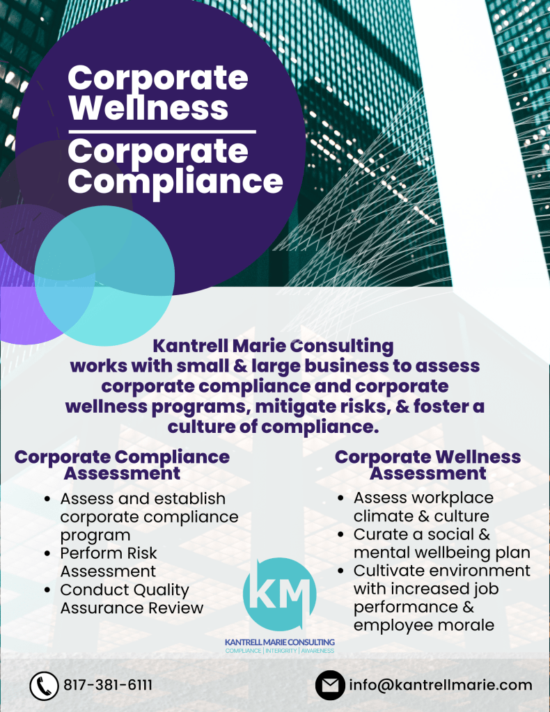 Does Your Compliance Program Measure Up? Posted bykantrellmarieAugust 11, 2022Posted inUncategorizedTags:compliance, corporatewellbeing, kantrellmarie, smallbusiness Share this: Email a link to a friend (Opens in new window) Email Share on LinkedIn (Opens in new window) LinkedIn Share on X (Opens in new window) X Share on Facebook (Opens in new window) Facebook Like Loading... Related
